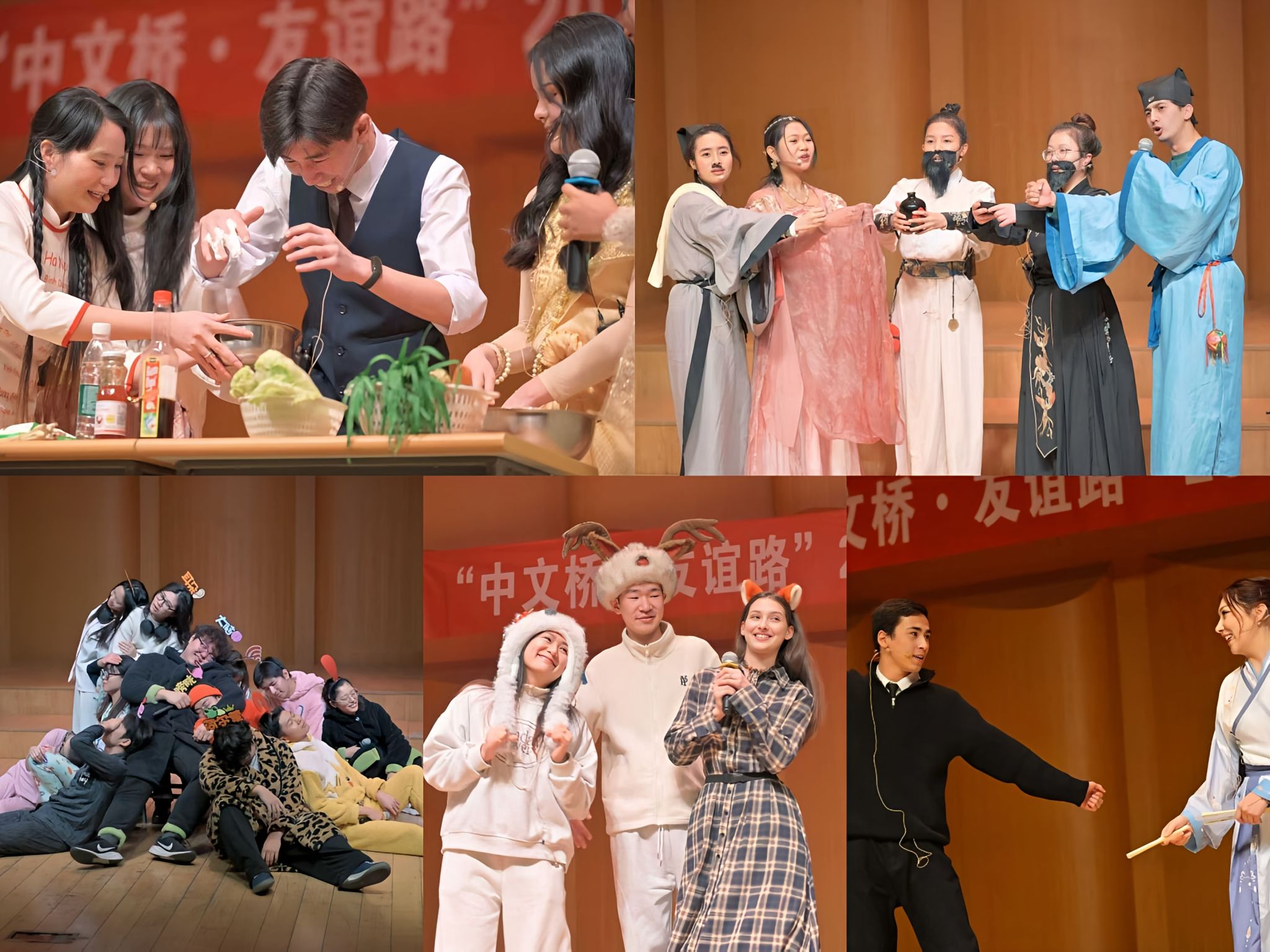 本科各年级的节目进一步凸显了不同文化的融合。一年级的《团圆饭的“亚”洲风》将亚洲不同国家多元习俗与中国传统节庆巧妙连接;二年级的《长安三万里》以精湛的语言和表演再现盛唐气象与诗人情怀;三年级的《国际饺子馆》则通过日常饮食哲学诠释“和而不同”的相处智慧。