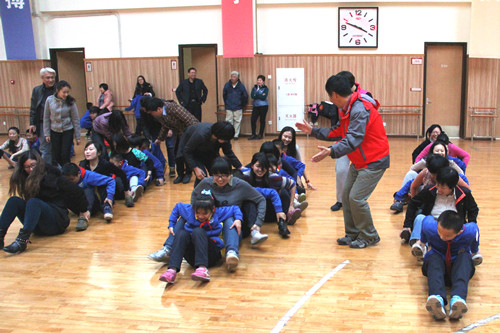 和盲人学生双人跳绳,对我们每一个人来说都是一次不小的挑战。一个带一个,刚一开始总是不能协调如一,但是在盲校老师的指导下。我们喊着口号,慢慢地找到了诀窍。一分钟记时,甚至有一组在一分钟跳了117个,这样的成绩也创下了盲校的记录。我们为之欢呼和感动,其后的传球接龙,蜗牛赛跑都是团体合作项目。尤其蜗牛赛跑。前一个人要抓住后一个人的脚踝,大家坐在地上,喊着口号共同前进。虽然在和盲人学生的合作中有所不便,但最重要的是我们能换位思考,用他们的心再次体会这个世界。这个世界也许不是由色彩足够,但是感动可触。我想这该是敬畏生命的过程。