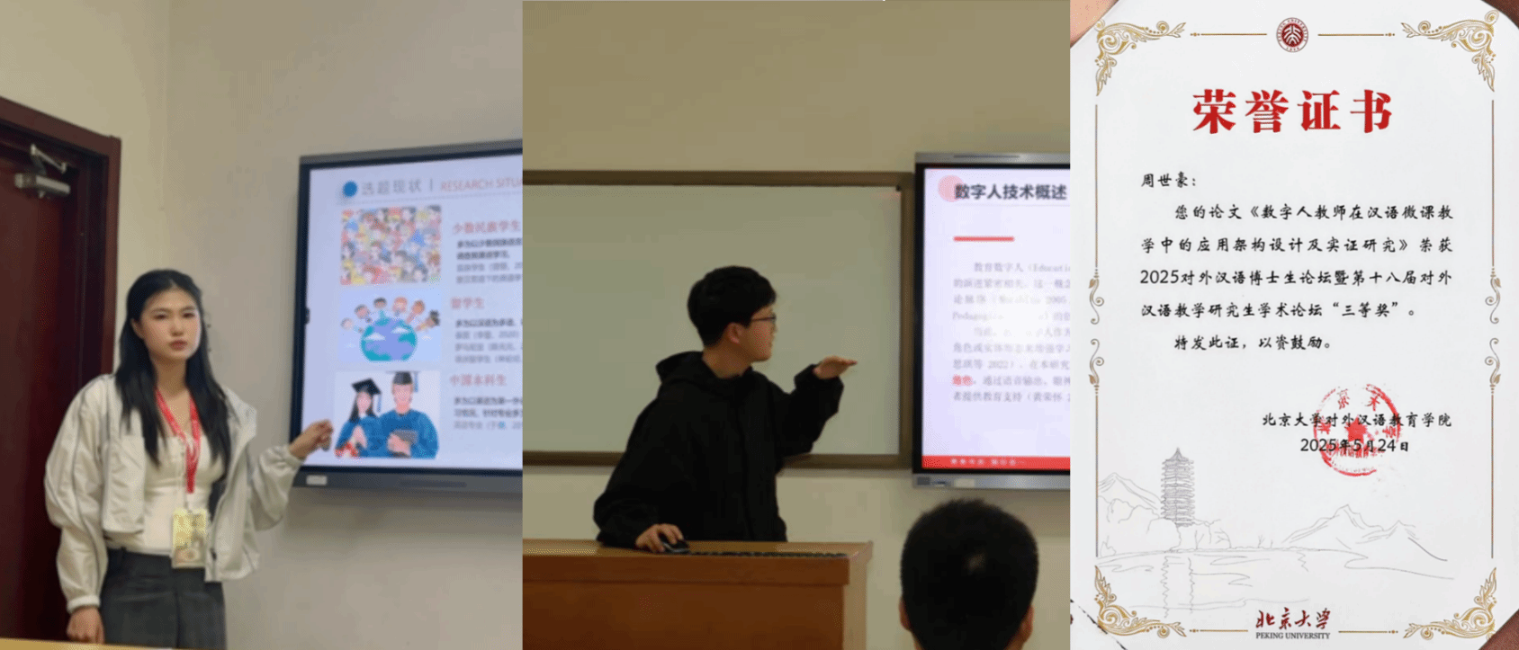 我院多名硕博士生在分论坛发表学术成果。2024级硕士研究生刘思杨作了题为《积极心理学视角的多语学习行为发展及其影响因素研究》的报告。该研究采用Q方法对汉语国际教育专业本科生的多语学习行为发展进行了追踪式对比分析。2024级硕士研究生周世豪报告了《数字人教师在汉语微课教学中的应用架构设计及实证研究》。研究聚焦于数字技术在汉语教学中的创新应用。
