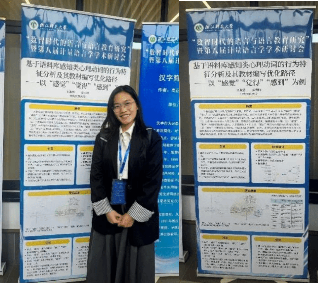 在海报展示中,2024级博士研究生刘淑慧展示了研究《基于语料库感知类心理动词的行为特征分析及其教材编写优化路径——以“感觉”“觉得”“感到”为例》。从语义、句法及语体等层面对汉语三个典型的感知类心理动词展开分析,并进行数据验证,提出了四项汉语教材近义词编写的优化建议。展示期间,刘淑慧同学围绕研究细节、数据支撑等问题与专家、学者展开深入对话,耐心解答现场提问。其研究的针对性与实用性获得广泛关注与高度认可,充分彰显了我院博士生扎实的学术功底和严谨的研究态度。