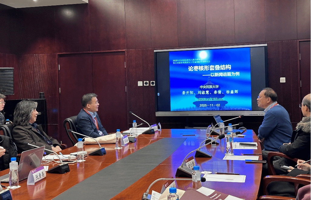 分组报告中,我院娄开阳教授作了题为《论枣核形套叠结构——以新闻语篇为例》的报告。他系统阐释了枣核形套叠结构的三大类型、构成方式及语义关系,并构建出20小类图式结构类型。报告引发了与会代表的热烈反响。