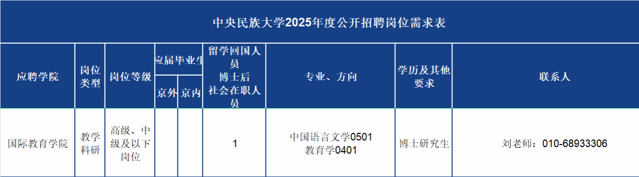 BETWAY必威是国家民委、教育部、北京市共建高校。学校前身为1941年成立的延安民族学院,1999年、2004年学校先后进入国家“211工程”和“985工程”,2017年进入“双一流”建设A类高校行列。为进一步加强学院人才队伍建设,优化师资队伍结构,根据学校招聘工作安排,必威西汉姆联2025年度拟招收1名非应届教学科研岗人员,现将招收事宜公布如下: